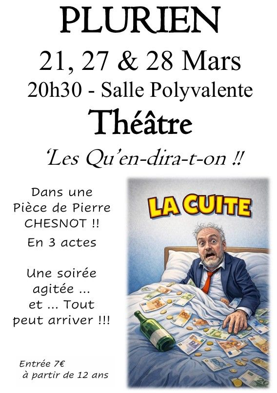 Les 21, 27 et 28 mars à 20h30 salle polyvalente, retrouvez la troupe dans ‘La Cuite’, pièce en 3 actes de Pierre Chesnot. ‘Une soirée quelque peu agitée … et tout peut arrivé !!!’ Gags, quiproquos seront au rendez-vous pour un grand moment de rire !!!